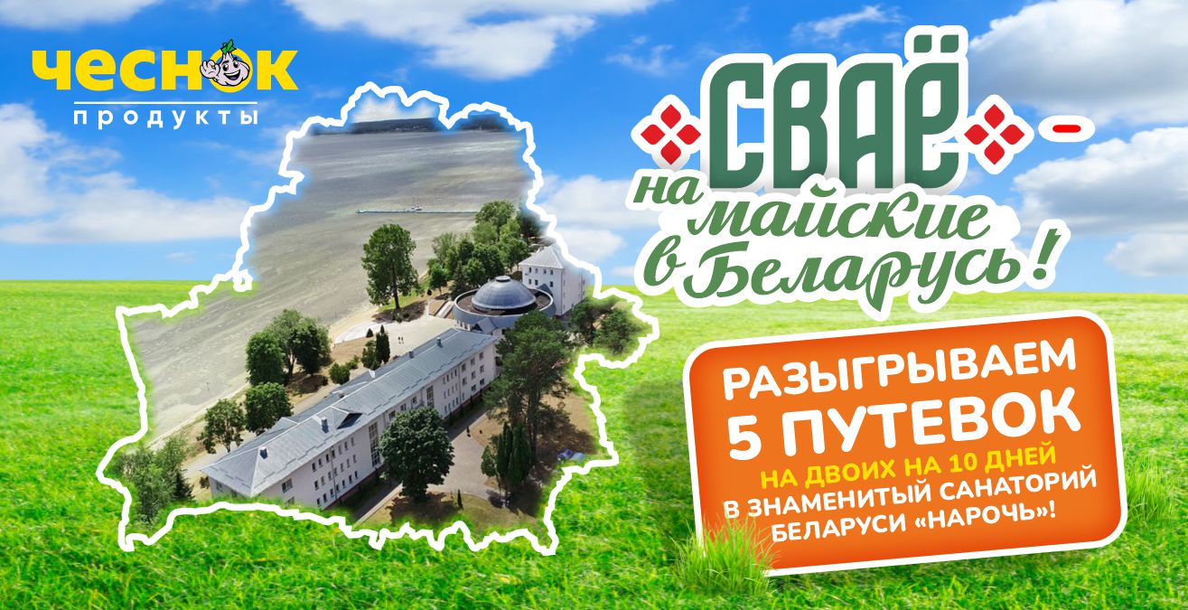 С 9 марта по 19 апреля 2026 г. принимайте участие в акции «СВАЁ - на майские в Беларусь!» и становитесь участником розыгрыша 5 путевок на двоих на 10 дней в знаменитый санаторий Беларуси «Нарочь».